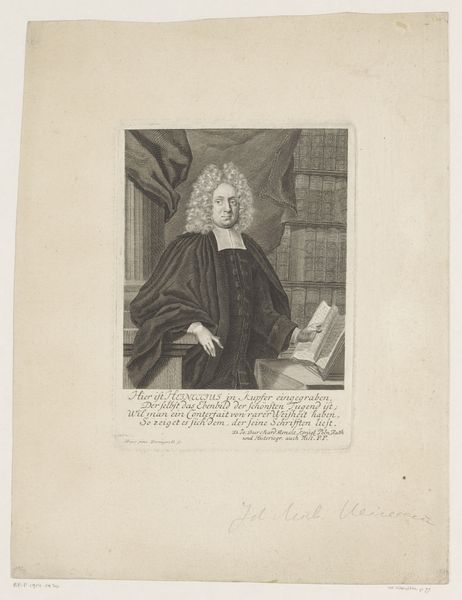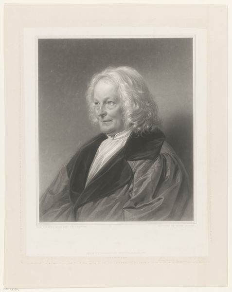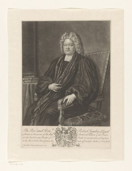 Charles Turner created this portrait of John Brereton using mezzotint. The image presents a study in contrasts, from light to dark, texture to smoothness. The composition employs chiaroscuro to sculpt Brereton's figure from the shadowy background, which gives it a three-dimensional form. Notice how the white of his cravat and the scroll in his hand draw the eye. This creates a focal point amidst the darker tones of his robe and the background drapery. The formal arrangement – the subject seated, the inclusion of scholarly objects – positions Brereton within a lineage of educated and influential figures. Consider the semiotic implications of the books behind him. They serve as signs of knowledge, and the texture rendered by Turner suggests an environment of learned contemplation. The print’s success relies on Turner's mastery of light and shadow to evoke a mood and communicate Brereton's status. This artwork invites ongoing analysis, a testament to the enduring power of formal elements in visual communication.