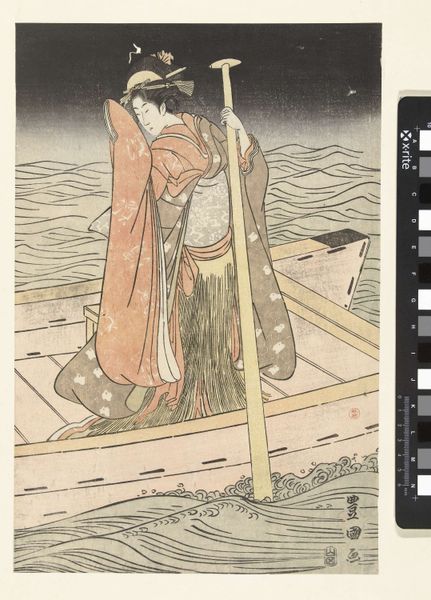 Editor: This woodblock print, “Courtesan and Attendant with a Cage of Fireflies” created between 1760 and 1780 by Ippitsusai Bunchō, is just captivating. The colors are so delicate, and the scene feels incredibly intimate. What cultural context is important to understand about this work? Curator: It's essential to see this print within the socio-political framework of Edo-period Japan, when the floating world, or ukiyo, flourished. Prints like these, depicting courtesans and their attendants, were commodities. They weren't merely artistic expressions, but circulated widely, shaping perceptions of beauty, leisure, and class distinctions. How does that knowledge change your perspective on this print? Editor: I guess it feels less like a personal snapshot and more like a constructed ideal, presented to the public. Did the popularity of these prints impact the lives of the women they depicted? Curator: Absolutely. These prints fueled the public's fascination with the courtesans, but also created a complex interplay between reality and representation. The women’s identities were often blurred, packaged, and consumed by society. Consider the symbolism of the fireflies and their cage - how does this relate to their position in society? Editor: It's striking. They're holding beauty captive, like these women may have felt held captive by their profession. What are your thoughts? Curator: I find it a poignant reflection on the commodification of beauty and the societal constraints placed on women, even those seemingly at the top of the social hierarchy. It urges us to look beyond the beautiful surface to see the structures and constraints that shaped their lives and legacies. Editor: It's fascinating to consider this print as part of a broader system. I will consider that going forward. Thanks for pointing out that prints like these play a role in reinforcing social structures.
