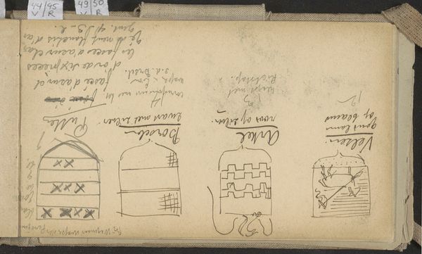 Antoon Derkinderen made this drawing of 'Wapenschilden van Waterland, Cuijck, Culemborg en Abcoude'—or, Coats of Arms of Waterland, Cuijck, Culemborg, and Abcoude—with ink on paper. At first glance, the composition is divided into four distinct heraldic shields, each meticulously outlined with precise linework. The formal design is evident in the symmetrical arrangement and balanced distribution of symbolic elements within each shield. The linear quality of the drawing is emphasized by its monochrome palette, highlighting the stark contrast between the dark ink and the pale paper. Derkinderen employs the visual language of heraldry to communicate identity and status. Each shield contains unique motifs and patterns, serving as semiotic markers that allude to the distinct histories and characteristics of the regions they represent. Notice the deliberate use of form and line, which not only define the aesthetic qualities of the drawing but also serve as cultural signifiers. The work invites us to deconstruct the visual grammar of heraldry and its role in constructing collective identities.