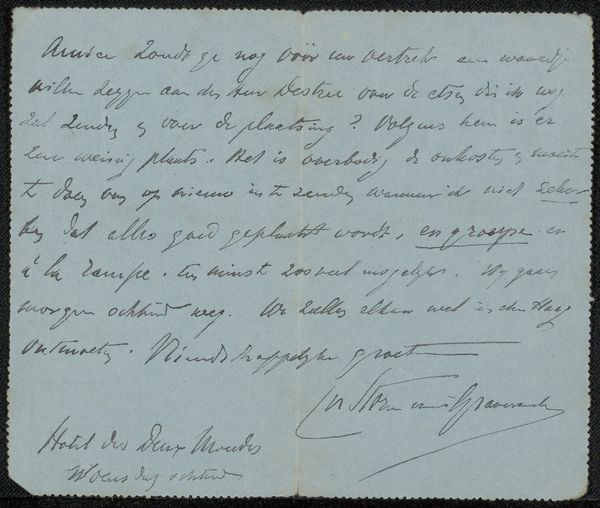 Curator: This letter, "Brief aan Philip Zilcken," likely from 1923, made with ink on paper, presents an intriguing insight into material exchange and social connection. What strikes you about it? Editor: I find it amazing that this everyday correspondence is being treated as art. How can you interpret such a simple material? Curator: Precisely! Its simplicity is key. Look at the paper itself. Notice the perforations, the slight discoloration, the evidence of its handling and storage. These material details speak to the letter's journey, from the writer's hand to the recipient, traversing time and space. How does this context influence your perception of its content? Editor: It adds a layer of intimacy, imagining the hands that held it, the postal systems involved… does the handwriting matter? Curator: Absolutely. The ink's texture, the script's flow – these are the marks of labor, of the physical act of communication. They stand in contrast to the speed and disposability of digital communication. The value resides not just in the words but the work that produces them. Is that craft elevated by function, or the opposite? Editor: That makes a lot of sense. So, it’s the social and historical context, embodied in the material itself, that transforms this letter into something more than just a message. I hadn't considered all that before. Curator: Exactly. We aren’t simply reading a letter; we're engaging with a material object that carries a network of relationships—between the writer and recipient, between art and life, and even ourselves and its legacy. A reminder that everyday production is art's material backbone.
