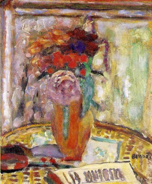 Roderic O’Conor made *Flowers*, with oil on canvas, and wow, what a delicious, juicy painting! Look at those colours, dark reds and fleshy pinks jostling with creamy whites and the zing of yellow in the vase and tablecloth. The paint is thick and alive, each stroke a physical event. You can almost feel O'Conor smearing, dabbing, and swirling the paint around. Notice how the brushstrokes around the edges of the flowers are loose, almost dissolving into the background. It’s as if O'Conor is more interested in the *idea* of flowers than in rendering them perfectly. See that one red rose, almost maroon, right in the middle? It's like a dark, velvety secret, pulling you into the heart of the painting. O’Conor reminds me of Soutine with his wild brushwork, yet the colour palette is more restrained, more intimate. It's like overhearing a whispered conversation – intense, but personal. The conversation of painting, always echoing through time.