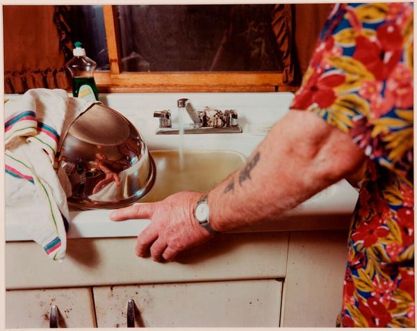 Curator: David Hilliard's photograph, “My Father’s Shirt (right),” presents a domestic tableau, a still moment captured in time. Editor: It feels very intimate, a bit like walking into a memory. The floral shirt juxtaposed with the stark stove, it's both vibrant and subdued. Curator: Exactly. The shirt, likely belonging to the artist's father, acts as a visual anchor, a pop of color in an otherwise functional, almost austere space. Think about how clothing signifies identity, memory, and even resistance. Editor: The hand resting on the stove with the lit cigarette... It's a powerful image. It invites us to consider the stories, the unspoken narratives, embedded in everyday life, perhaps even the anxieties of domesticity and masculinity. Curator: It is a story waiting to be told. So many possible interpretations of that moment... Editor: It's interesting to consider how one object, like a shirt, becomes a vessel for so much meaning, so much feeling. Curator: It's about connections, isn't it? To family, to the past, to ourselves.