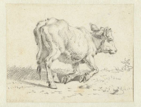Jacobus Buys made this drawing of two resting cows using pen in brown ink, on paper. This isn't your typical art material like oil paint or marble. The choice of ink and paper brings a sense of immediacy, as if Buys quickly captured a scene from everyday life. Notice how the brown ink creates a warm, earthy feel, perfectly matching the pastoral scene. The fine lines made with the pen allow for detailed shading, giving volume to the cows' bodies. It also creates a sense of texture in the grass and foliage. Drawings like this one were often studies for larger paintings or prints. The scene reminds us of the Dutch landscape tradition, where farm animals were symbols of prosperity. The drawing serves as a reminder of the Dutch relationship with the land, and the agricultural labor that shaped their economy and culture. It blurs the boundaries between fine art, documentation, and social commentary.