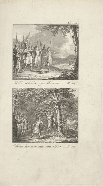 Curator: Here we have “Gezelschap bij een op de grond liggende figuur tussen bomen,” which translates to “Company with a Figure Lying on the Ground Among Trees." Daniël (I) Veelwaard created this engraving in 1823. Editor: It feels incredibly staged, doesn't it? Like a theatrical tableau. Everyone is frozen, gazing in a specific direction. There's something almost melancholic about the stillness. Curator: Well, engravings of this era often served as illustrations for stories. Knowing that it’s a narrative scene shifts your perception a little, doesn’t it? It adheres to conventions prevalent in early 19th-century Dutch art, placing common folk in heightened scenes that tell some kind of story. Editor: True, situating it as part of visual storytelling adds another layer, a social commentary perhaps? Look at the clearly defined classes here. The affluent family in the centre are elegantly framed against a very artificial backdrop. Then to the side we have labourers scrambling in the dirt as one falls over. Are they observing class division as they watch the "lower" classes hurt themselves? Curator: It’s interesting you bring up social commentary, because I agree the placement is interesting. Veelwaard's prints often engage with the moral anxieties of his time, and consider questions of responsibility in this context. Who exactly is supposed to bear the consequences of any entertainment is certainly being pondered by Laura, apparently. It says so at the bottom of the artwork! Editor: It really makes you consider art's power in shaping social values at the time. Was Veelwaard supporting a conservative worldview, highlighting what he believed where examples of good behaviour? Curator: Perhaps he felt these characters existed beyond reproach, which reflects much about the social standards. This particular print definitely prompts viewers to dissect assumptions of decorum in relation to the hierarchy of status, which prevailed at that point. Editor: That's a strong point, looking at the image through the lens of social politics helps clarify it's intentions and it's influence. It makes the piece feel much less passive. Curator: Exactly, by analysing the roles within this gathering and how it spoke to audiences and continues to, we're seeing how art and popular stories can both influence culture in fascinating, layered ways.