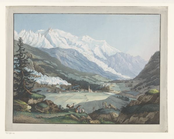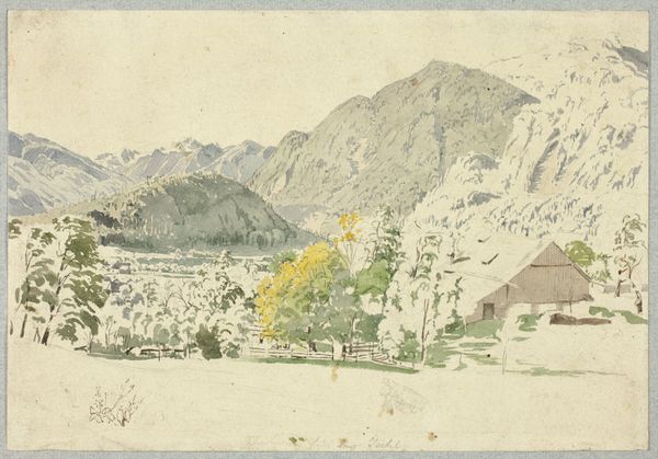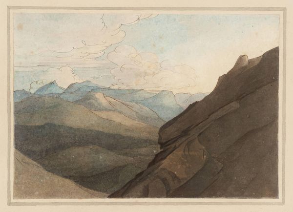 Curator: What a view. The kind that makes you catch your breath, isn’t it? A vast, hazy vista, mountains tumbling into one another, receding into the distance. It feels almost...sepia-toned somehow. Editor: Precisely! You’re looking at "Isar Valley near Mittenwald," a watercolor likely rendered en plein air by Eduard Wilhelm Pose sometime in the 19th century. Now part of the Städel Museum collection. It's interesting how you use "sepia-toned" given that watercolor as a technique often prioritizes those kinds of earthy tones. Curator: Ah, that's plein air for you, breathing in the landscape and exhaling it onto paper! And you’re right about the technique; I almost get a wash effect across the whole work. Do you think he labored to capture detail or prioritized feeling and impression? Editor: Definitely the latter, I believe. Consider the social and political role of art at this time; landscape painting, especially in the Romantic vein, was about cultivating a specific kind of national feeling – awe at nature's grandeur, a sense of belonging to a place... meticulous detail wouldn't necessarily serve that purpose. I think he's more focused on the overall emotional impact. Curator: Right! A perfect scene to inspire, say, a soaring symphony, or maybe a dark gothic poem filled with foreboding… Look how the sunlight catches just the peaks in the distance; a perfect beacon above such vast, complex forms beneath. Do you see something of the sublime here? Editor: Undoubtedly. Romanticism wrestled with these concepts of the sublime, in nature especially. The museum system at this time sought to highlight nationalistic visions and reinforce traditional hierarchies by commissioning or otherwise supporting grand visions that reinforced a specific sociopolitical vision of that cultural entity. Curator: Makes you wonder about what the Isar Valley represents beyond geography, in the collective mind, then and now! Editor: Exactly. This artwork, as with much of 19th century landscape painting, can be analyzed for these subtle manipulations through art and the state's control. Curator: So much packed into a little painting…! Editor: Precisely; art history shows us the broader frameworks we need to appreciate it!