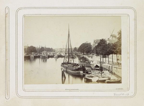 Curator: Immediately striking is the way this cityscape uses the waterways as a mirror, doubling the intensity of the urban landscape. Editor: Indeed. We are looking at "Gezicht op het Damrak in noordelijke richting met op de voorgrond een beurtschip" – or a view of the Damrak facing north with a barge in the foreground – an albumen print made by Andries Jager sometime between 1860 and 1875. It is currently held in the collection of the Rijksmuseum. Curator: I find the tonal range captivating, especially the interplay of light and shadow that animates the buildings along the canal. The repetition of vertical masts also draws my eye, guiding me through the scene, almost like musical staffs on which to read the rhythm of the port. Editor: The image certainly encapsulates a key period in Amsterdam's history. You see the Damrak, a vital artery for commerce, bustling with activity. These canals weren’t merely picturesque; they were crucial infrastructure for the city's economic power. Note too that photography like this, enabled documenting this transformation for wider consumption and urban pride. Curator: Looking at it more closely, there's a striking geometric quality – the rigid rectangles of the buildings contrasted with the organic curves of the boats. Then the reflections, which almost entirely abstract the bottom portion of the piece... Editor: Exactly, which, structurally, provided vital access facilitating trade, a pillar of Dutch society then and a significant national symbol of ingenuity over nature itself. It shows how infrastructure literally underpinned the Netherlands rise as a global superpower. The camera then made accessible, understandable, that network and its function in social terms to ordinary folk. Curator: Fascinating how form follows function then... And yes, seeing it now, Jager's manipulation of focus gives the scene depth. It pushes some vessels out of sharp detail. He emphasizes those closer to the foreground; the rest almost dissipate into a generalized haze. Editor: That detail provides not just aesthetics but historical context to understand the visual and cultural consumption, as new photographic technology intersected with traditional artistic motifs. These prints became widely circulated, shaping public perception of Amsterdam. Curator: Overall, the image’s organization leads to a captivating tension and resolution between architectural and nautical elements and historical dynamism. Editor: Yes, through the study of art like this we understand the convergence of socio-economic progress and shifting means for communicating it within society itself.