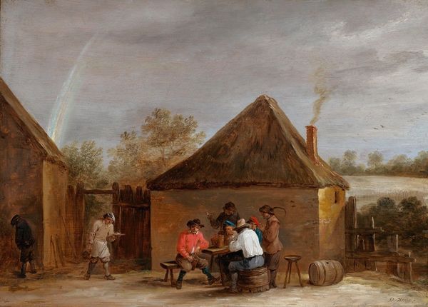 Curator: Adriaen Brouwer’s "Drinkers in the Yard," painted in 1631, presents a candid scene of everyday life. It offers a glimpse into the social customs of the Dutch Golden Age. What strikes you immediately about it? Editor: It's the grittiness. You can almost feel the damp earth underfoot, smell the stale beer, and hear the low rumble of voices. The whole scene feels very material, grounded in the earth and in human activity. Curator: Exactly, Brouwer frequently depicted such genre scenes, offering a glimpse into the lives of ordinary people, often those on the margins of society. The painting could be viewed as a reflection on class distinctions, and societal structures. What might such scenes have communicated to the bourgeois audience? Editor: For me it comes down to craft, Brouwer uses earth tones and varied brushstrokes to distinguish between textures – from the weathered wood of the fence, the roughly-hewn furniture, to the ruddy faces of the drinkers, each carefully observed, reflecting light in a different way to distinguish how it all has been produced, and the circumstances they lived in. This all speaks of the labor inherent in existence, blurring the lines between ‘high’ and ‘low’ art, almost making a commentary on material conditions of labor, leisure and life. Curator: Interesting. I see something else. Brouwer challenges our perspective, confronting us with individuals often ignored. Perhaps Brouwer's perspective is offering us a mirror to observe our implicit social bias, our expectations that correlate status and leisure. This challenges contemporary narratives about labor and the construction of a self-actualized existence. It asks, how does societal pressure define "worthiness" or dignity? Editor: But consider also the materiality of the canvas, and the oil paint itself! Pigments are derived from the earth; mixed carefully and layered precisely – and look how skillfully and physically the artist constructs this moment from everyday material elements transformed into something of lasting value that depicts other common materials turned useful by human endeavors! Curator: So, whether questioning societal norms or understanding how the scene captures reality by considering materiality, "Drinkers in the Yard" sparks a relevant discourse. Editor: A tangible and thought-provoking artwork – truly!