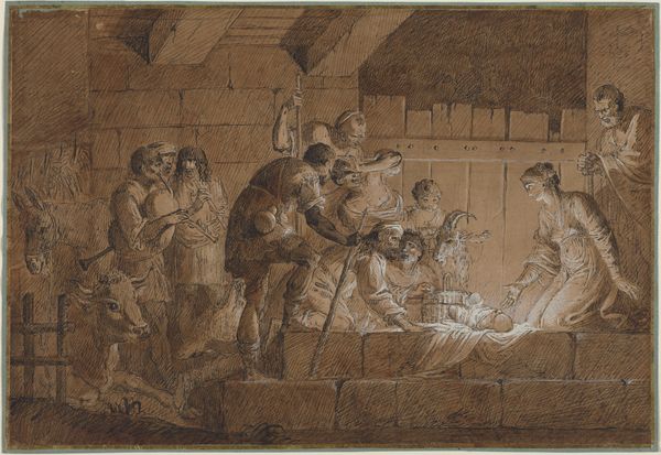 Curator: The scene almost vibrates with warmth despite its understated sepia tones. A cozy little riot. Editor: This drawing, "Peasants Carousing in a Barn," by Adriaen van Ostade, rendered in pen and brown ink with brown wash, invites us to consider precisely such "cozy little riots," as you put it. The artwork likely dates from around 1637-1639, part of the Dutch Golden Age's fascination with everyday life. Curator: Ah, Golden Age grit! It reminds me of overhearing gossip in a pub—everyone leaning in, bodies a bit too close for comfort, secrets sloshing around like cheap beer. You can almost smell the… earthiness. Editor: Observe the formal elements, how Ostade uses the oval composition to compress the figures, enhancing the sense of crowding and confinement, yet also intimacy. Notice, too, the tonal range— how it models the light filtering through the barn's rough-hewn timbers to shape and define forms. The dark wash creates depth, while the delicate pen work adds texture to faces and clothing. Curator: It's that dance of light and shadow that gets me. The figures emerge from the gloom, lit just enough to catch a mischievous grin or a weary slump. It is all very stage-lit. Editor: Indeed. And think about how genre paintings like this served their audiences. Ostade offers not just a snapshot of peasant life but also commentary, perhaps about the pleasures and pitfalls of indulging in simple pleasures, or how we perform collective identities. Curator: Pitfalls, definitely. There's a moral subtext humming beneath all that boisterousness. A silent sermon. Although I’d bet those guys were just glad to be out of the cold for a bit, sharing a pint and some tall tales. I am feeling drawn in like a moth to a rather rowdy flame. Editor: Ostade was masterful at condensing the scope of observation onto a single scene, in which formal elements elevate these earthy moments into reflections of society. Thank you for drawing that out. Curator: It's a conversation that, just like those peasants, could go on all night, in the best possible way.