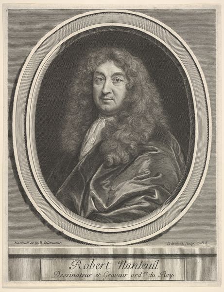 Curator: This striking engraving, dating roughly from 1831 to 1900, offers a captivating portrait. It is called 'Portret van Robert Nanteuil' and attributed to Jean-Baptiste Meunier. What's your initial impression? Editor: Well, my immediate thought is that there's something deeply familiar and melancholic about the image. The sitter’s expression and the heavy, baroque wig... they speak of a bygone era of formal portraiture. Curator: Indeed. The baroque influence is significant here, visible in the luxuriousness of the hair and drapery. In terms of visual language, what do you see here? Editor: The meticulous line work really defines the character, particularly those cascading curls, each rendered with care. The engraving gives it a tactile, almost photographic realism, yet the overall feel is somewhat romanticized. And I am curious about what status being engraved meant at the time. Curator: The realism serves to heighten the subject's presence and lends the piece historical gravitas. The engraving process, of course, allowed for wider dissemination of images, thus democratizing art to an extent but also freezing certain social representations of this stature. How was portraiture of someone of the stature and why reproduce them so much? Editor: Well, engraving provided an important service, solidifying and circulating not only visual imagery but also concepts of power and personhood to an eager public. It helped create, or rather confirm, an understanding of this public figure and those closely surrounding him. The portraits of the powerful, or people perceived as successful, have had great appeal for centuries. Curator: I agree. It highlights the careful crafting of image as ideology; a method for both preservation of status and also perhaps a longing, now past but with continuous ripples of cultural memory still reaching the present day. Editor: Absolutely. Thinking about this engraving really drives home how constructed and communicated notions about people truly are. This exploration allows for a look into not just what they believed this person to be, but moreover what did his time perceive as of utmost importance, for an individual. Curator: Exactly. It makes us really question what these curated displays and what public roles images continue to play for society. Editor: Food for thought, certainly. Thanks to this picture and exploration, I shall rethink and refeel it more deeply as time progresses.