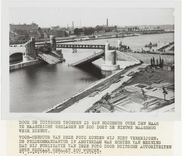 Editor: This photograph, entitled *Herstelde spoorbrug Zutphen*, or Reconstructed Railway Bridge Zutphen, was taken sometime between 1946 and 1948, likely by Anefo. The monochromatic tones create a serious mood, don't you think? All that heavy iron work seems so…determined. What do you see in this piece, that I might be missing? Curator: It feels like looking at a phoenix rising, doesn't it? You've got this stark image of reconstruction, so soon after devastation, of *survival*, in a way. The bridge isn't just metal and concrete; it's a symbol, arching over that river like a promise of tomorrow. Notice how that lone figure standing at the base gives a sense of scale, but also...quiet hope. It is realism tinged with dreams, perhaps? What story does *he* carry, do you think? Editor: That's a beautiful image! The phoenix. He does look rather pensive, doesn't he? As though considering all that went before, and all that will follow. I'd been focusing on the steel latticework, the almost brutal geometry. Curator: Absolutely! The geometry gives it such strength, and it speaks to the modernist aesthetic. But even that unforgiving geometry can't completely extinguish the underlying emotion. Maybe that's why it resonates so deeply. It reminds us that even from destruction, beauty, and perhaps even something like peace, can emerge. Editor: I see that now. It's about more than just bricks and mortar, isn't it? Or in this case, steel and rivets! Thank you for sharing your insight. I'll never look at a bridge the same way again! Curator: And I’ll remember to look for the phoenix within the girders, thanks to you! It is a conversation, always a two-way street.