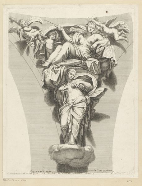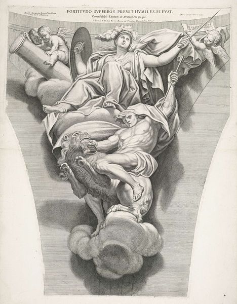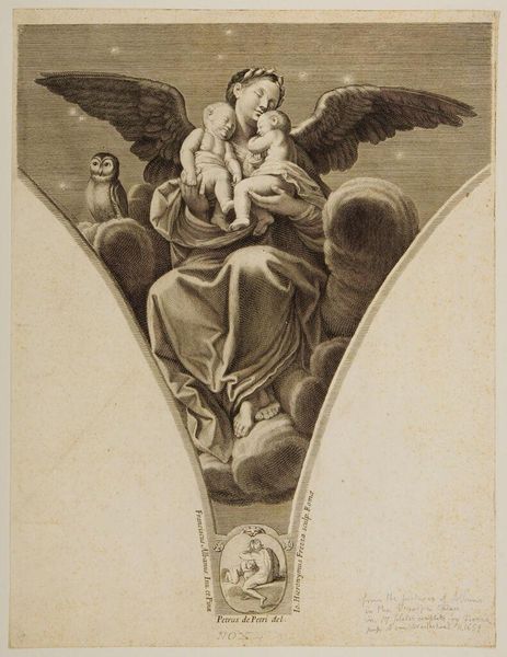 Pietro del Po created this engraving titled 'Prudentia', where we see Prudence, the embodiment of wise foresight, amidst a flurry of symbolic activity. Prudence is assisted by putti, holding a mirror and snake, and has Father Time below her. The mirror, held aloft by a cherubic figure, is no mere vanity; it reflects truth and allows one to see clearly. The snake, often associated with deceit, here suggests wisdom, echoing the ancient symbol of the ouroboros – the snake eating its own tail, representing cyclical time and introspection. Consider how these symbols recur across centuries. The snake, for instance, appears coiled around the staff of Asclepius, the Greek god of medicine, a symbol of healing and knowledge. The hourglass held by Father Time at the bottom shows that every decision should be made with consideration for time. These aren't just allegorical props; they are vessels carrying centuries of collective memory, evolving yet rooted in primal human understanding.