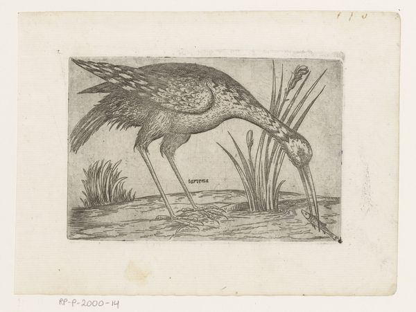 This print of a corn crake, or ‘Kwartelkoning’ in Dutch, was made in the early 17th century by Jacques de Fornazeris. It is an etching, a printmaking technique that involves biting lines into a metal plate with acid, which are then inked and printed. Look closely, and you can see how the network of etched lines defines the bird’s form, giving it volume and texture. Note, for instance, the fine hatching suggesting the soft plumage of its feathers. The etcher’s skill lies in their ability to render the natural world through controlled, repeatable, linear marks. This print belongs to a tradition of naturalistic illustration, documenting the flora and fauna of the period. It's worth considering that printmaking in the 17th century was a complex interplay of artistic skill and industrial-like production. Such prints were made to be consumed, collected, and studied, reflecting a growing interest in the natural world, and new modes of knowledge dissemination. Ultimately, the significance of this work lies not only in its subject, but also in its method, and in what that can tell us about the social context in which it was made.