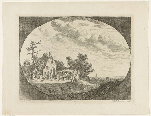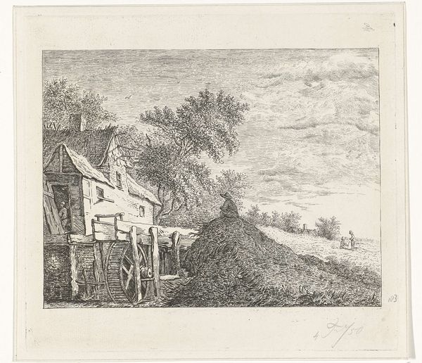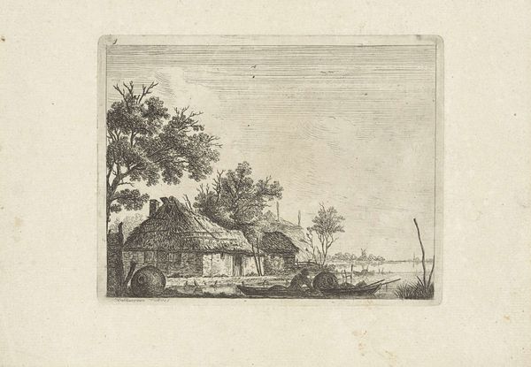 Hendrik Schwegman created this etching, "Landschap met boerderij" – or "Landscape with Farmhouse" – during a time of significant political and social change in the Netherlands. Schwegman, living between 1761 and 1816, would have experienced the shift from the Dutch Republic to the Batavian Republic, influenced by the French Revolution. This small print invites us to consider the lives of rural people in a changing world. Here, the etching technique allows for a play of light and shadow, enhancing the rustic texture of the thatched roof and weathered walls. The lone figure, hunched over some task, seems deeply connected to the land, his labor integral to this setting. The intimate scale draws you in, fostering a close, almost personal connection with the scene. Instead of grand narratives of war or politics, Schwegman focuses on the everyday. This emphasis offers a quiet, yet powerful commentary on the value of rural life, subtly underscoring the dignity of labor and the enduring connection between people and their environment.