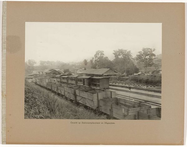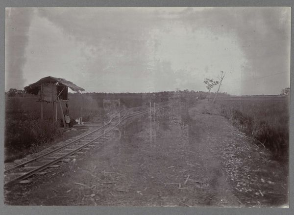Editor: Here we have a photograph from around 1890-1895 entitled 'Spoorlijn van San Cristóbal naar San Miguel de Tucumán in Argentinië' by Georges Poulet. The blue tone gives it a ghostly, historical feel. It shows a railway being built. What strikes you about this image? Curator: Immediately, I see a document of production. This image, likely a cyanotype given its blue hue, highlights the material realities of building a railway in Argentina at the turn of the century. Note the raw materials scattered— timber, tracks. It's not just about the romantic landscape; it's about the labour required to transform it. How does the composition contribute to this sense of labour? Editor: The railway tracks leading into the distance draw your eye, but the workers in the background almost blend into the environment. Curator: Exactly. The photographic process itself plays a role here. Cyanotypes were often used for technical drawings and documentation. The accessibility and relative ease of the cyanotype process connects directly with its use here as a functional means of documentation of construction and progress. Think about what the photographer, Poulet, might have been intending to document - beyond the immediate construction - with these images. Editor: So you are saying that this image has less to do with art and more to do with… labour? Curator: Not 'less to do with art', but it challenges a certain elitist definition of what art *should* be. This photo forces us to acknowledge the global supply chains, the exploitation of resources and labour, that enabled Argentina's infrastructure development. It's beautiful, but also deeply implicated. Editor: I never considered how much the medium itself speaks to the message. Thanks for broadening my understanding! Curator: My pleasure. Looking at the materiality is critical to fully interpreting many works and it has certainly shifted my thinking on this one!
