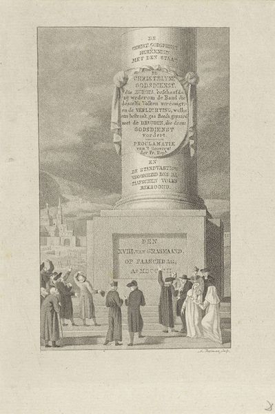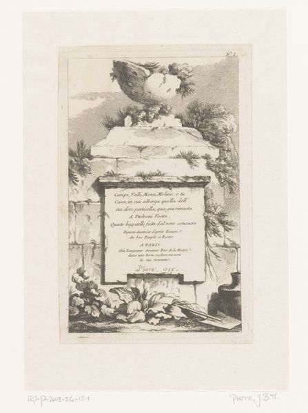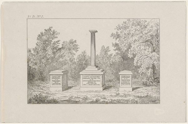 Curator: At first glance, I perceive an elegant, melancholic atmosphere, a stark contrast etched in monochrome. The crisp lines create a sense of formality, yet the composition feels surprisingly intimate. Editor: This is the “Grafmonument voor C.S. Duytsch overleden 7 november 1795,” an etching and engraving crafted in 1795. These prints often served as memento mori, reflecting on mortality within the domestic sphere. Curator: Memento mori, yes, undeniably. We see the traditional symbols – the skull, the extinguished lamp, and the scythe. Note how the light pierces through the clouds, almost directly above the urn – it adds such a strong feeling of celestial judgment. Editor: That light also speaks to the Neoclassical style so prominent at the time. The rigid architectural structure of the monument itself is interesting. We must consider the Duytsch family within the social and political upheavals in Europe during the late 18th century. The grave site becomes a politicized location of history. Curator: Precisely! And notice the weeping willow, a motif loaded with symbolism. It speaks to mourning, remembrance, a romantic acceptance of sorrow which reflects the emotional weight of death within this community. Editor: Its placement to the right anchors the design. Considering F.C. Duytsch created this work, we wonder what motivated the commission? Was it a direct personal expression of loss, an almost political performance, or an inherited role fulfilling social custom for posterity? Curator: That duality makes the engraving incredibly compelling. It becomes both deeply personal and publicly performative – the enduring personal grief intertwined with the societal need to create lasting records of lives within history. What stories do you see when looking at the skeletal remains in the composition? Editor: The etching masterfully communicates the socio-political anxieties around familial history, identity and inheritance. I imagine those bones also remind viewers that status offers no reprieve from the end. Curator: This careful composition invites contemplation. It captures a complex array of cultural beliefs surrounding loss, remembrance, and how visual art immortalizes individuals for posterity. Editor: It leaves one to wonder about the lives and experiences of the Duytsch family against the backdrop of revolution and change in Europe. What lasting impact might one hope to leave on this ever-transforming world?