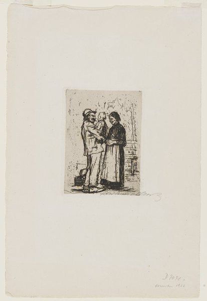 Curator: This stark image immediately strikes a somber note, wouldn’t you agree? It feels incredibly heavy, almost like wading through mud, just like those figures there. Editor: Precisely. The artwork we’re looking at is "Soldats Sous La Pluie et Dans Les Fondrières," or "Soldiers in the Rain and Mire," by Théophile Alexandre Steinlen, created in 1915. He utilized etching and ink to achieve this very textured print. Curator: Etching…yes, the visible crosshatching and varied line weights are clearly visible in the bodies and the spaces they are occupying; how do you see it shaping the image, formally? Editor: Well, look how the light struggles to emerge in a composition dominated by the downward scratching; in these grim, shadowed visages and burdened forms, one feels the unrelenting deluge, both literal and psychological. And look at the signature! 'T. Steinlen': as if he himself only had a bare, reduced mark on the face of things! Curator: I would agree; for me the means of production can't be ignored: here we have what feels like a mass-producible print aimed at a mass audience during the First World War. What could it have meant for those at home looking at it? Editor: Consider how he manages to distill so much despair into something relatively small. Curator: It speaks volumes about how printmaking could democratize not only art but social commentary in times of crisis. Editor: I notice, too, how he does that. Observe how the lines both define and dissolve the figures simultaneously, almost like they're one and the same with the harsh atmosphere they have to contend with! Curator: By distributing prints, an artist could voice their concerns more publicly at a time when propaganda machinery often overshadowed dissenting opinions. Editor: Absolutely. Seeing it as part of a historical moment is one important lens. But also understanding its own formal and aesthetic achievement brings us to what? It has, for over a hundred years, moved viewers. Curator: Precisely: the intersection of historical context, artistic choices, and accessible formats—I mean, these aspects invite many levels of understanding, making this such an affecting historical object. Editor: Absolutely. And in that way, one might glimpse how such an image becomes timeless, and what accounts for its emotional grip over decades of change.