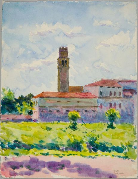 Editor: This watercolor is called "S. Maria Maggiore, Venice," by Denman Waldo Ross. It reminds me of a postcard, a little faded, evoking a sense of serenity. What do you see in it? Curator: It whispers of Venice, doesn't it? The ochre walls, that slender tower – it's as if Ross captured a fleeting moment, a memory bathed in sunlight. Do you feel the tranquility, almost a melancholic beauty? Editor: Yes, definitely melancholic. The bare tree in the foreground adds to that feeling. Curator: Exactly! It's not just a topographical study; it's a mood piece. I wonder what Venice meant to Ross, what stories he carried with him as he painted this. Editor: I hadn't considered the personal connection. Thanks, that's really interesting. Curator: Art's a conversation, always.