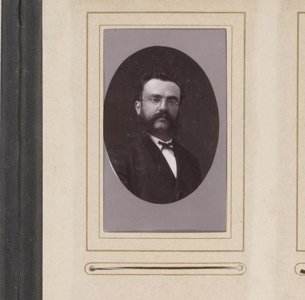 Editor: Here we have Friedrich Singer's "Portret van een man met snor en baard," made sometime between 1850 and 1900, using albumen print photography. The oval format gives it a sort of formal, historical feeling. What catches your eye when you look at this portrait? Curator: The beard, immediately. Notice how deliberately it's shaped, how much care was put into presenting that particular image. The beard, in that era, became a signifier - often signaling masculinity, wisdom, even a certain artistic leaning, a rebellion against clean-shaven conformity. Does it convey those attributes to you? Editor: I can see that. It’s not just a beard; it's a statement. Almost like the carefully chosen props in a painted portrait. Curator: Precisely! And the gaze - slightly averted, thoughtful. It invites the viewer to speculate. Albumen prints, especially in portraiture, allowed for a dissemination of images like never before, contributing to the rise of celebrity culture, almost creating secular icons of public and private citizens. This wasn't just a likeness; it was a carefully crafted presentation of self. Do you think that’s still happening today? Editor: Oh definitely, just think about social media profiles! Seeing the symbolism through the lens of photography really opens up a new way to read these old portraits. Curator: Indeed, it's all about decoding the image and recognizing its continued relevance to us. I found myself thinking how persistent this game of constructed personas remains throughout history and cultures.