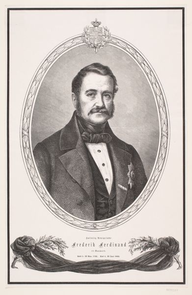 Curator: This is a lithograph from 1862, titled "F. H. Grüner," now housed in the collection of the Statens Museum for Kunst. Editor: There's a rather imposing figure, isn't there? Stern, but with an air of… well, satisfaction, perhaps. The artist uses strong chiaroscuro. It accentuates a palpable presence. Curator: It’s a striking depiction, no doubt. Lithography during this period offered artists a cost-effective way to disseminate imagery, particularly portraits of notable figures to wider audiences. Grüner, I believe, was a figure of some local prominence. Editor: The texture is remarkable, isn’t it? Notice how the hatching creates depth, particularly in the coat, yet it also manages a certain lightness around the face. The gaze is quite compelling; though fixed to the side, there is a commanding self-assuredness. Curator: Indeed. In terms of visual politics, the portrait style aligns with the emergent national identities forming at that time, presenting the subject as a pillar of society. The lack of ornate background also emphasizes this and focuses on the subject's importance. Editor: Yet that bare background provides an intriguing minimalist quality, almost isolating him. There's something quite potent in that very lack. Also note how the button placement draws attention down to the corner where the subject fades off the page, a subtle form of depth I appreciate. Curator: An interesting point. The choice of rendering him in lithograph would, of course, have political implications. Was the goal of the work for broad dissemination? How might that intention impact our understanding of Grüner and the role he played? Editor: Perhaps, or maybe the artist admired the texture achievable through lithography, which creates that illusion of weight. We should consider how lithography lends itself to portraying character, shaping our perceptions and ideas around this character. Curator: It's a nuanced interaction between those aesthetic capabilities of the media and their reception in the time of great political changes. This tension encapsulates why Grüner is more than just a historical record, but also an enduring social artifact. Editor: Well put. The image certainly captures the spirit of an era and a specific sense of personal conviction.