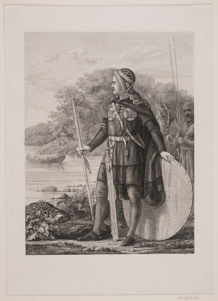 Editor: This drawing, “Portret van Franz von Auersperg,” made sometime between 1880 and 1884, depicts a nobleman in elaborate attire. It strikes me as quite theatrical; his pose and costume feel more staged than candid. What symbolic weight do you see in his clothing and posture? Curator: Indeed. Look at the layering of fabrics, the elaborate patterns, the very deliberate inclusion of the feather in his cap. Each element functions as a signifier. The patterns on his robe, for instance, might allude to specific familial achievements or affiliations, echoing cultural memories and perhaps legitimizing his status. Consider the colors as well—do they align with heraldic traditions, thereby communicating particular messages to those ‘in the know’? Editor: That’s fascinating! I hadn't considered heraldry specifically. Does the sword signify anything beyond just his nobility? Curator: The sword is loaded with meaning. Beyond the obvious symbolism of power and martial prowess, consider the placement and presentation. It is not brandished aggressively, but rests passively at his side. What does this tell us about the *kind* of power he wishes to project? Is it power inherited, gently guiding, rather than actively seized? Does the subtle gesture, in fact, communicate more potency than overt aggression might? Editor: That makes so much sense! I'm now thinking about how every choice in the portrait might reinforce this specific narrative. Curator: Precisely! And how those choices weave into the broader tapestry of the era’s understanding of leadership and identity. Every image has its own story to tell, but in fact all images come together and continue weaving our world’s narratives forward. Editor: Thank you! This new way of looking at details has really opened my eyes to hidden meanings.