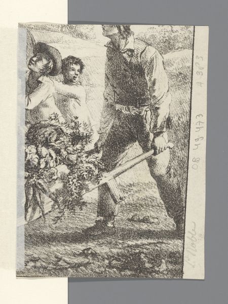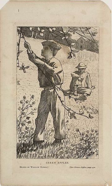 Curator: Alright, let's talk about Winslow Homer's "Green Apples." It's an 1868 wood engraving, a print on paper, residing here at the Minneapolis Institute of Art. Editor: First thought? It feels incredibly wistful, almost melancholic, despite the youthful subjects. The scratchy lines give it a texture that's both delicate and a bit raw. Like a faded memory. Curator: I think you've hit on something important there. Homer was working as an illustrator for magazines like "Harper's Weekly" at the time. These weren’t meant to be timeless masterpieces, but immediate, relevant images reflecting contemporary life. In this instance it seems to depict kids doing kid things during the apple harvest. Editor: Harvest, right! Though there's an interesting duality—one boy seems really determined to grab something from the higher branches while the other is just... sitting there. Curator: Definitely. The composition places the active boy in the foreground, almost like he's reaching for a future, maybe even an unattainable goal, represented by those high apples. The seated figure, by contrast, embodies quiet contentment, settling with what's readily available, or is merely contemplating the landscape. Editor: It also tells a certain story of boyhood. The labor and then rest of labor is here. I wonder, too, about that texture again. Is that roughness purely a result of the wood engraving process, or does it reflect something deeper? Like the often-uncomfortable experience of growing up during that time? Curator: Good question! There’s always going to be something of the industrial baked into this process—these images were meant to be widely disseminated in a democratic gesture of the proliferation of image making—But it also mirrors a nation undergoing intense change, fresh off the civil war. The etching embodies an element of disquiet that would soon fade once etching styles changed along with a newly forming American ethos of productivity, leisure, and technological development. Editor: Thinking about those contrasts, I'm reminded that what appears as simplicity—boys, apples, landscape—is layered with emotions and commentary about where we find ourselves in our life journey and American experience, as if Homer, with each scratch of his tool, wanted us to question simple pleasure of an American pastime like going out to pick apples. Curator: And perhaps those tart green apples represented something as-yet-unripe for the burgeoning American soul as it strove to remake itself! Well, thanks for helping to unlock those perspectives on this image. Editor: Thank you; I'm taking with me new eyes and thoughts for simple afternoons in an apple orchard.