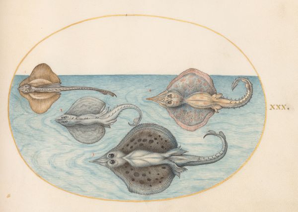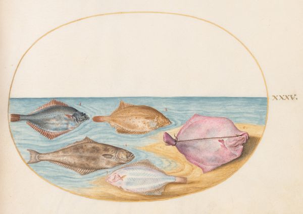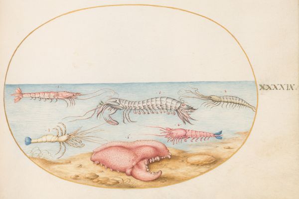 Art Historian: Welcome. Today we are looking at "Plate 52: An Argonaut, Squid, Hermit Crabs, Shells, and a Crab," a work made around 1575 to 1580 by Joris Hoefnagel. It's meticulously rendered in watercolor and coloured pencil. Artist: Wow, look at this little underwater tableau! It feels so whimsical, like a Renaissance screensaver or something. I mean, look at the colors, all soft and dreamy. And that little pink nautilus...utterly charming! Art Historian: Indeed. Hoefnagel was a key figure in the Mannerist movement. His work reflected a period grappling with representing the natural world amid shifting scientific paradigms. It also highlights the rising interest in natural history and collecting, especially in aristocratic circles. Artist: Collecting, huh? It does feel a bit like a curiosity cabinet exploded onto the page. I'm curious about that little drama between the hermit crabs, the way they seem to almost pose with the empty shells! Art Historian: The scientific accuracy mixed with obvious artistic flourishes are a hallmark of his work. Naturalists often employed artists, which meant the social status and wealth connected to the subject matter had as much value as a strict taxonomic accuracy. Artist: I bet. This reminds me a bit of childhood visits to aquariums. Except Hoefnagel's critters seem a bit…happier? Almost self-aware, like they know they’re being immortalized. Art Historian: The artist produced imagery that suited certain wealthy patrons of his day, like Emperor Rudolf II, for whom Hoefnagel also worked. Rudolf in particular fostered art and scientific development hand-in-hand. Artist: What a time to be alive, even if you're just a crab chilling on a beach made of paper! This piece just sings with playful wonder. There's something eternally captivating about that naive wonder that science was infused with. Art Historian: It shows us that observing nature was often a process embedded in social and political contexts. Each brushstroke potentially spoke to more than just observable fact. Artist: A feast for the eyes and mind indeed. Thank you. Art Historian: It was my pleasure.