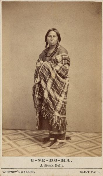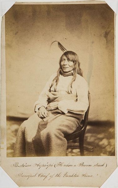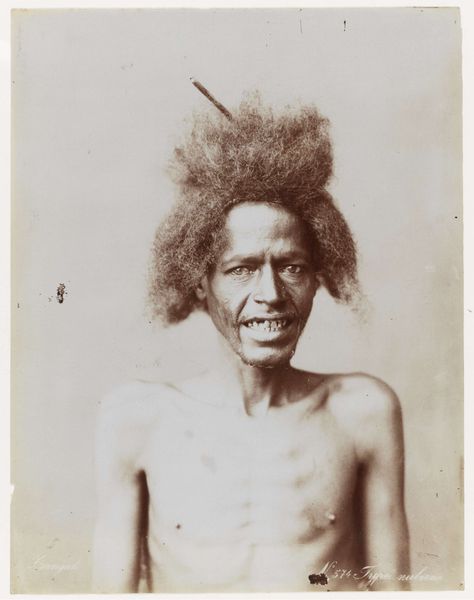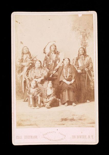 Curator: What a striking image! This is "Untitled (a Toda family)" by Willoughby Wallace Hooper. Hooper, who lived from 1837 to 1912, captured this photograph, now held in the Harvard Art Museums. Editor: It feels raw and a little bit haunting, doesn’t it? Their expressions are so direct, almost confronting. There's a vulnerability, even though they’re clearly posing. Curator: Hooper was part of the British colonial administration in India, and photography was often used to document and categorize indigenous populations. Editor: That colonial gaze is palpable. Yet, there's a human connection here too, wouldn't you say? I wonder what the subjects thought as they were photographed. It feels charged with unspoken narratives. Curator: Absolutely, and the composition – the man centered, the women flanking him – reinforces certain power dynamics, but perhaps, also familial bonds. It's complex. Editor: It makes you think about the ethics of representation, doesn't it? I'm left pondering the layers of cultural translation and the enduring power of a single captured moment.