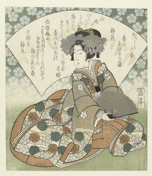 Curator: Looking at this captivating print, titled "Kersenbloesem", dating from around 1829, housed here at the Rijksmuseum, made by Yashima Gakutei, I can almost smell the tea brewing! Editor: The initial impression is one of calm formality. The subdued color palette and intricate patterning create a sense of measured elegance. I immediately zoom in on the woman's steady gaze; there's an intensity held within this delicate arrangement. Curator: Absolutely. The woman depicted is likely a high-ranking courtesan, partaking in a tea ceremony. Note the symbolic presence of the cherry blossoms in the background. Cherry blossoms have always served as powerful metaphors, echoing sentiments about life's ephemeral essence in Japanese art. The placement suggests an embrace of life’s beauty and brevity. Editor: I'm particularly struck by the composition—the subtle balance achieved through contrasting shapes, how the fan's arc echoes her posture, creating unity across the plane. The patterns also seem to be creating a hierarchy: notice how it ranges from intricate patterns on the kimonos, background, to just flat coloring near the bottom of the work, which directs the eyes back toward the courtesan. Curator: You see that echoed pattern beautifully. Furthermore, notice the inscription on the fan—poems written in calligraphy emphasize the fleeting beauty of the cherry blossoms, enriching our cultural narrative on feminine roles in artistic renderings during that time. Each character contributes layers of appreciation on time's passage in art, as with real cherry blossoms. Editor: True, but it is the formal quality of color that draws me: that black pot with a perfect arc for its handle contrasts powerfully with that ornate gold brazier. The lines create implied lines of tension throughout the plane that, through geometry and color relationships, create visual momentum through static materials. Curator: Indeed, it seems to be speaking a story through color and shape. Examining all its layers gives one such perspective shift in looking to the future that our past artwork can provide, like it reminds us never to hold grudges too long. Editor: I would summarize by adding that it highlights the subtle, but deeply structured ways to derive pleasure from just simply sitting in front of good craftsmanship.