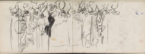 Isaac Israels made this drawing of two standing women with graphite on paper, and it feels like he’s working out something in real-time. The marks feel loose and tentative, like he’s feeling his way around the forms. You can see the texture of the graphite, how it catches on the page, creating these little sparks of light and shadow. Look at the right-hand page, at the darker figure—the way the graphite is built up, almost like a sculptural form emerging from the paper. There’s a real physicality to it, a sense of the artist’s hand moving across the surface. It reminds me a bit of some of Degas' drawings, where he's capturing these fleeting moments of everyday life. But Israels brings his own sensibility to it, a kind of raw, unvarnished quality that I find really compelling. It's like you're witnessing the birth of an idea, the messy, beautiful process of creation.