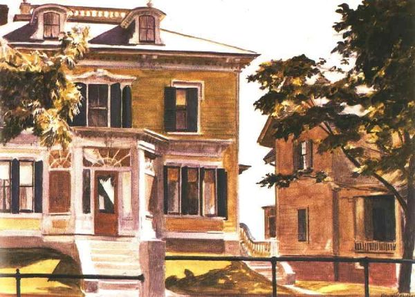 Edward Hopper made this watercolor, "The Mansard Roof," in 1923. The image reflects a uniquely American take on European architectural trends. The titular mansard roof, an import from 17th-century France, signified wealth and prestige in the United States during the late 19th century, but by the time Hopper painted this, such houses were quickly falling out of fashion. Hopper presents an ambivalent view of this fading upper-class domesticity, at once celebrating and critiquing the culture surrounding this building. Hopper invites us to consider not only the visual aspects of the painting, but the cultural values, social changes, and even the economic shifts that shape the landscape of early 20th-century America. To fully understand the significance of Hopper's "The Mansard Roof," you might explore the architectural history of the period. Researching historical photographs and real estate records could also reveal much about the building itself and the social class it once housed.