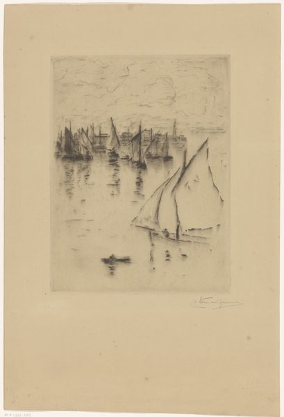 Curator: Before us is Joseph Pennell's 1884 etching, "Below Chestnut Street Bridge, Philadelphia," currently residing at the Art Institute of Chicago. The piece employs ink on paper, depicting a bustling scene of maritime activity. Editor: The stillness is compelling. The reflections are like ghost ships hovering under a murky mirror. It feels like industry meeting quiet contemplation, perhaps the lull before the start of the working day. Curator: Pennell created this piece at a pivotal moment, amidst rising industrialization. Waterways teemed with commercial activity. The river, however, also symbolized a critical space for immigrant populations who found work along the ports and harbors. Pennell engaged deeply with labor and class disparity. Editor: Yes, I am thinking about how he achieved this with printmaking, a process inherently linked to labor. Each pull requires careful craftsmanship. You can see the artist's hand in those lines – they are so immediate, capturing the specific qualities of light and shadow that are made even more expressive by the textures that he builds on the page with closely hatched line work. Curator: Pennell positions the viewer so that our vantage point includes observing these scenes in between the large ships that signal expanding American capitalism, reflecting a complex, evolving socio-political environment. Editor: There’s a starkness, too, maybe connected to the material honesty of etching. Unlike grand oil paintings meant to immortalize powerful individuals, the scale and mark making communicate a commitment to a more straightforward record of everyday experiences. Curator: Indeed. What’s interesting is thinking about how art captured a sense of urban life during such economic shifts. The symbolism inherent within that shift becomes visible when analyzing how these industries influence individual lives. Editor: Looking at the labor of making this print, and also seeing this scene showing workers ready to put labor into those vessels is striking! These rivers have powered global capitalism with very clear conditions, even at its beginning. Thank you, this look has been helpful for drawing out this connection to the labor. Curator: Indeed, focusing on the labor, race, and class associated within this landscape certainly enriches our interpretation of it. Thank you for these interesting comments.