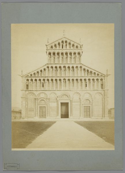 Editor: This photograph, taken by Carlo Ponti between 1852 and 1893, showcases the facade of the Santa Maria di Nazareth church in Venice. The muted sepia tones and the building's strong symmetry give it a formal, almost stoic, feel. What symbolic weight do you think this building, as captured here, would have held? Curator: Consider the setting: Venice, a city built on water, reflecting and refracting light. Churches often symbolize stability, faith, and community. In this image, the architectural grandeur communicates power, but the water...what does the water whisper? Is it a grounding element, or does it amplify the ephemeral nature of earthly things? Do you think that contrast carries a spiritual lesson? Editor: Perhaps the water suggests both Venice's strength and its vulnerability. It makes me consider how physical structures and belief systems both offer us support. Curator: Indeed! The water also acts as a mirror, doubling the church, perhaps symbolizing the relationship between the earthly and divine realms, mirroring and completing each other. And note the repetition of figures – a chorus of saints observing the world. They suggest both collective belief and a legacy across time. What could be a contemporary parallel for representing community so resolutely? Editor: I hadn't thought of the saints as a community witness! Maybe large public murals serve a similar function today? They make values public, even communal. I am curious how viewers over the centuries might read those layers so differently. Curator: And so, the photograph is not merely a representation but a palimpsest, a layering of meaning etched onto a moment in time, to be deciphered and felt across generations. It seems to preserve a desire for order and meaning.