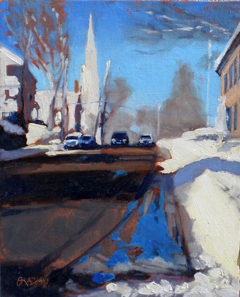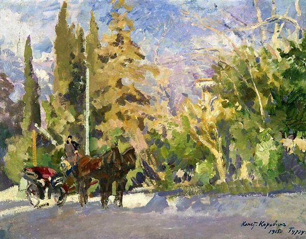 Curator: This oil painting by Dan Graziano is titled "Turn On Red," and it seems to depict a fairly common urban scene. I’m immediately struck by its vibrancy. What’s your initial take? Editor: A collision! Not literally, but the composition throws together different eras, different paces of life. The horse-drawn carriage against the backdrop of modern cars and buildings creates a visual friction, a fascinating kind of disharmony. Curator: Indeed. The horse and carriage immediately command the viewer's attention. For centuries, the horse has represented power, status, even freedom. Does that resonate here? Editor: I wonder. While the horse might traditionally symbolize freedom, here it's harnessed, quite literally bound to the demands of the tourist industry. It raises questions about labor, about tradition commodified. Are these gentle giants historical symbols or simply entertainers, cogs in the contemporary urban machine? Curator: I see your point. Looking closer, the traffic light stuck on red looms, a potent symbol. Red often signals warning, danger, even prohibition. It injects a sense of unease into what at first seems like a picturesque scene. The painting pushes against idyllic images of this mode of transport and offers something else. Editor: Absolutely, and notice the palette itself. Despite the lively brushwork, there’s a muted quality, a sort of urban haze that diminishes the colors. This isn't a romanticized cityscape; it's grounded, raw even, reflecting the reality of the city for its residents. Curator: And Graziano's embrace of plein-air painting, capturing the scene directly from life, adds to that sense of immediacy, don't you think? He’s not recreating an idealized image from memory, he’s engaging with the city in real-time. Editor: Which allows for those authentic, slightly unsettling juxtapositions. "Turn On Red," with its mix of modes and muted colors, invites us to see the city not as a static backdrop but as a place of ongoing negotiation between past and present. Curator: A fitting assessment, reflecting on cultural heritage, historical processes, and the reality of labor, this work certainly makes an interesting point. Editor: Yes. Next time I encounter one of these carriages, I’ll remember this artwork and give its context a second thought!