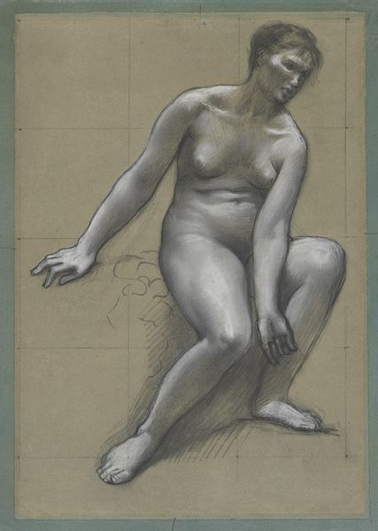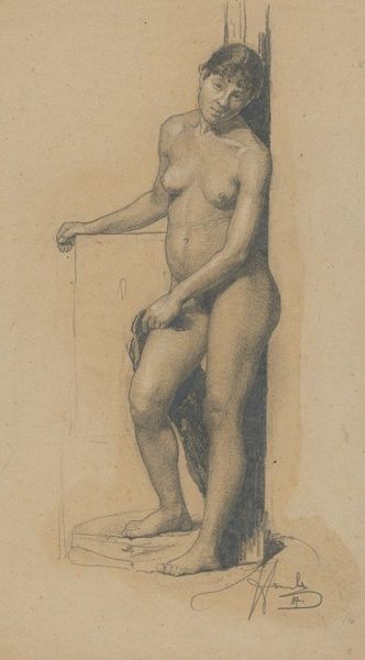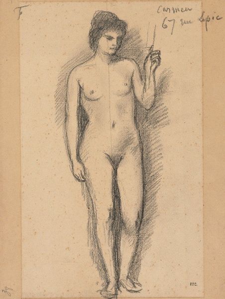 Editor: So, this is Gustave Courbet's "Standing Female Nude" from 1849, a pencil drawing. The figure is quite… robust, and seems very self-assured. What do you see in this piece, especially given its context? Curator: What strikes me is the raw depiction of the female form. Courbet’s realism challenged the idealized and often sexualized nudes prevalent in academic art. Do you notice how he eschews classical beauty standards in favor of portraying the model with a palpable sense of groundedness? Consider the socio-political implications of presenting an unidealized female nude at a time when women's bodies were heavily policed and aestheticized in art. Editor: Yes, the contrast with traditional nudes is quite evident. There's an unapologetic quality to her form that feels radical for the time. What about the pose? It seems so deliberate. Curator: Exactly. It is critical to view her pose through an intersectional lens of gender and class. Note how she leans against what appears to be an artist's easel – it signals a creative power, as she owns her image, which deviates from how female nudes are traditionally posed passively as objects of male consumption. What feelings do you get when viewing this art work? Does this impact you or cause internal disagreement? Editor: I think... a kind of defiance? Not aggressive, but firm. It is powerful, seeing a female representation that owns her identity, or takes the position that would usually be reserved to the artists that depict women. Curator: Precisely. Courbet doesn't shy away from portraying the female body outside conventional constraints. His image encourages the audience to think about gendered ways of seeing and being. Editor: This definitely shifted my understanding of the artwork and historical time! The way it challenged social norms then – and continues to provoke questions now – is quite compelling. Curator: It really shows how art can function as social commentary and challenge existing power dynamics, it invites critical reflection. And this in turn invites change!