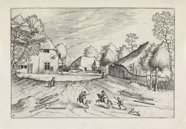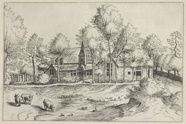 Editor: This drawing, titled "Gezicht op een dorp met een kerktoren," or "View of a Village with a Church Tower," created between 1559 and 1561 by Johannes or Lucas van Doetechum, captures a seemingly simple scene in ink. What I find fascinating is the way this humble, rural setting gains significance through the social implications of its architectural focal point—the church. What's your take? Curator: Well, looking at this engraving, it's important to understand the role of landscape imagery during the Northern Renaissance. These weren't just picturesque scenes; they were often tied to burgeoning national identities and burgeoning religious ideologies. Editor: That makes sense. How so? Curator: Think about it: the church tower isn’t just a landmark. It visually anchors the community, suggesting a shared belief system and, potentially, the controlling influence of religious institutions on daily life. Do you notice anything about how the houses compare to the church? Editor: Yes, the church is noticeably taller and seems more fortified. So, this piece isn’t just about showing a village, but possibly about suggesting a particular power dynamic within that community. Curator: Precisely! And these prints were widely distributed, making them important tools in shaping perceptions of the social landscape. This image, while seemingly serene, invites questions about power, faith, and communal life during a period of great religious and social change. Editor: I never thought of landscapes holding such significance. Now I see it's about more than just pretty scenery. Curator: Exactly. And that realization is key to appreciating its enduring impact on artistic expression and cultural memory.
