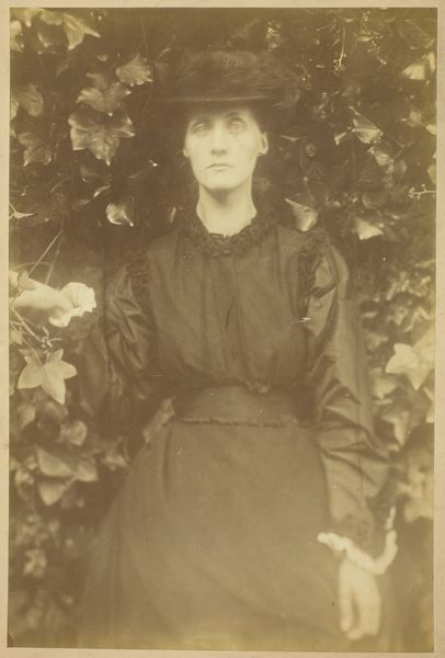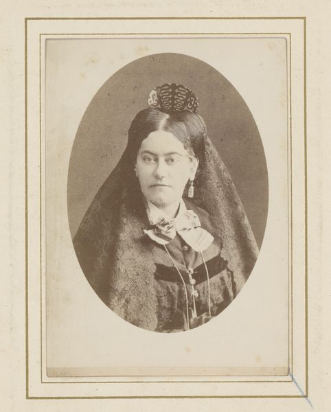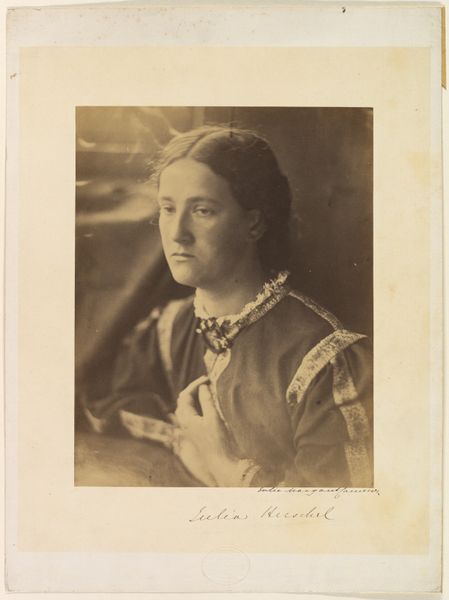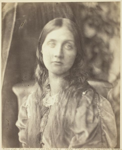 Curator: Let's consider this striking portrait by Julia Margaret Cameron, titled "Mrs. Herbert Fisher," created around 1864. It's a gelatin-silver print currently residing at the Art Institute of Chicago. Editor: The soft focus immediately evokes a sense of intimacy, doesn't it? The oval format containing the sitter concentrates my gaze directly on her face, a face that exudes vulnerability and depth. Curator: Absolutely. Cameron was revolutionary in her embrace of the imperfections and contingencies of early photographic processes. Her choice of the gelatin-silver print as a medium during that period also reveals an engagement with the evolving chemical processes and aesthetic possibilities being opened by industry. It was faster and allowed more detail than earlier processes. This wasn’t accidental—it was tied to changing economic and technological circumstances. Editor: Yes, but those supposed "imperfections" - the soft focus, the visible flaws - I'd argue that these elevate the portrait beyond mere representation. The blurred edges give it a timeless quality, like a Pre-Raphaelite painting striving toward higher meaning. The composition centers on her face, her features almost archetypal. Curator: But doesn’t the "romantic" interpretation obfuscate Cameron's role as an active participant within Victorian visual culture? These portraits served very particular purposes, helping to constitute familial identities, circulating likenesses amongst networks of friends. We have to recognize photography in Victorian England was often intended as an activity meant to define new forms of social bonds within rapidly shifting socio-economic circumstances. Editor: Perhaps, yet there is an undeniably artistic impulse at play. The dramatic light, almost sculptural modeling of Mrs. Fisher's face - and look at the textures. Even the small circular necklace, a focal point drawing the eye downward - each element enhances the visual narrative. It pushes toward pure aesthetic engagement. Curator: I find your point valuable. It pushes me to look deeper into both artistic choices while at the same time realizing their relation to wider historical dynamics. Thank you. Editor: The pleasure was all mine. Analyzing the beautiful intricacies can deepen the understanding of our world, even by simply discussing formal choices like light and texture.