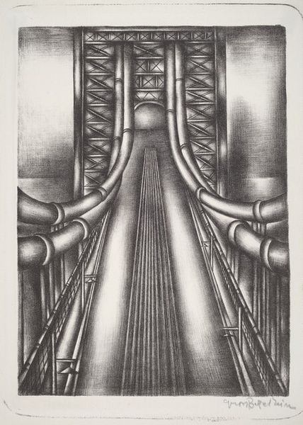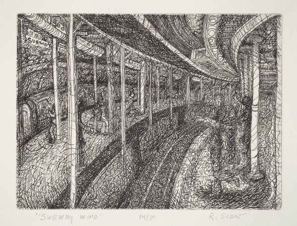 Editor: This is August Mosca's "Subway Tunnel," from 1977, a graphite and charcoal print. The strong vanishing point really pulls me in, but what strikes me most is how the texture of the materials creates this gritty, almost claustrophobic atmosphere. What do you see in this piece? Curator: For me, it's the layering of material reality that's most compelling. Look at how Mosca uses the printmaking process – an inherently reproducible medium – to depict a space that is both public and deeply isolating. He elevates a site of everyday labor, the subway, to something worthy of artistic contemplation. The print's edition number points to a larger question. Editor: You mean, about reproducibility? How many people will experience this same vision of the subway? Curator: Exactly. This is about access. Consider the socio-economic implications of public transit itself, who uses it, and how their labor contributes to the functioning of the city. The artist's labor, mediated through the tools and techniques, allows us to see the built environment and its social uses with new eyes. Is Mosca valorizing that experience, or commenting on its alienating effects? Editor: I hadn't considered the printmaking aspect as a parallel to the mass transit system itself, but that makes perfect sense! Curator: Right, and where does the act of observing the world become art making, especially when an everyday thing like commuting is reproduced for the art market? Does this change our relationship with the work, the labor of the worker, or the system that supports their work? Editor: Thinking about it in terms of materials and labor has really changed my perspective on this piece. I'm seeing a lot more than just a subway tunnel now! Curator: Indeed. The material reality offers us insights into the cultural context in which Mosca made his work. Art invites this line of questioning; Mosca urges us toward it.