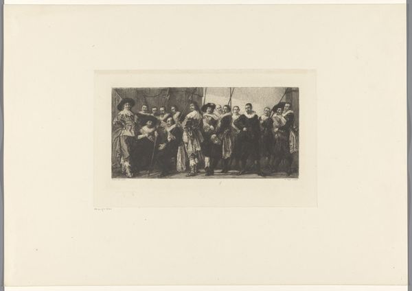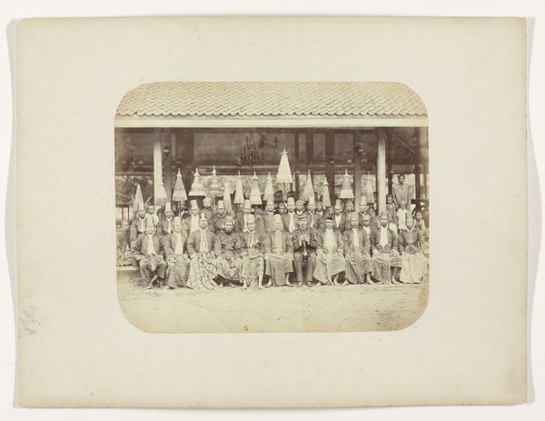 Editor: Here we have a gelatin-silver print titled "Gekostumeerd voetbalelftal van het Centraal Kantoor voor de Statistiek te Batavia," possibly from 1935, showing a large group of people. It feels like a moment captured, almost staged, yet candid at the same time. What symbolic meanings can you unpack from such a seemingly simple image? Curator: It’s far from simple. Consider the very idea of costume here. In the colonial context of Batavia, now Jakarta, the Dutch administrators dressing up… are they mimicking the locals? Mocking them? Projecting power? It resonates with layers of cultural appropriation, hinting at deeper power dynamics through the act of performance. What cultural memories might the different costumes invoke for different viewers then and now? Editor: I didn’t think of it that way! I was more focused on the novelty of the soccer team in costume. Curator: Precisely. And how might the symbolism of the team sport – a very Western import – contrast or clash with the adopted personas and costumes? Are they building connections or creating a spectacle? Perhaps the blend illustrates the tensions of colonial society. Is it playful or unsettling? Editor: Unsettling, I think. The costumes now feel less celebratory and more like…caricatures. Curator: Caricatures can often unveil deeper psychological projections, anxieties and desires that often reveal more about the creator and society. The act of costuming becomes a coded language. The cultural and emotional impact is undeniable, raising significant questions about the gaze, cultural exchange, and historical representation. Editor: It gives me a lot to consider. Thanks for pointing out those hidden symbols; now I have a better understanding of how loaded an image like this can be. Curator: And perhaps, now you’ll look at other images with fresh eyes, seeing beyond the surface.