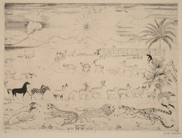 Editor: So, this drawing, "Cityscape, Horses, a Deer and Dogs," made around 1840 by Johannes Tavenraat, is a whirlwind of ink on paper, currently held at the Rijksmuseum. It feels like catching a glimpse into the artist's mind; fleeting and fragmented. What do you make of this piece, with all its energetic scribbles? Curator: Energetic scribbles, you say? Precisely! It's less a formal portrait and more a visual brainstorm, wouldn't you agree? Like a chef sketching out flavor profiles. See how the animals are all in motion? Tavenraat’s capturing raw energy, maybe even experimenting with how to depict movement itself. What do you notice about the way he's rendered the building versus the animals? Does it give you any clues? Editor: Well, the building feels more… deliberate, almost like he’s establishing a setting. But the animals do feel much more spontaneous and free-flowing, like they're about to leap right off the page! It’s interesting how he juxtaposes the static and the dynamic. Curator: Exactly! It makes you wonder what narrative, if any, he was trying to build, or if it was just a free flow exercise of his imagination and skills. Consider it a dance between control and freedom, wouldn’t you say? Do you find yourself making up stories as you observe the work? Editor: Absolutely! I see the hounds chasing, a horse escaping, a carriage arriving at the distant estate… it’s all incredibly suggestive! I almost get the feeling that I can construct my own reality from it. Curator: Indeed. The true beauty of such works resides not just in what the artist placed on the paper, but what they inspire within us. That, I think, is magic. It helps us observe how a sketch can spark grand narratives. Editor: That's given me a fresh perspective on sketches, to be sure, almost like windows into the creative process, and, moreover, an invitation. Curator: Exactly, an invitation to become part of the creation. Wonderful!