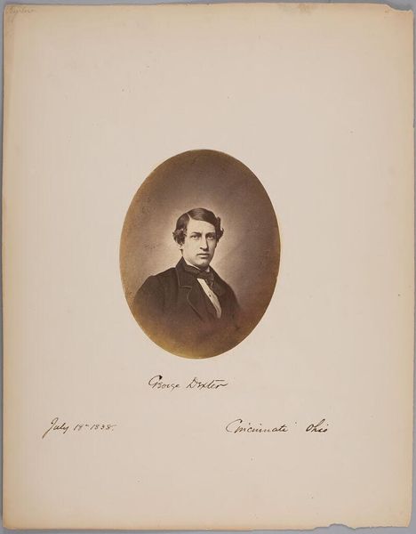 Curator: Looking at John Adams Whipple's "Fisher Ames, Cambridge (1838-?)", I'm immediately struck by how formal and contained the sitter appears, almost like a cameo. Editor: Yes, it’s interesting to consider this early photographic process. Whipple was working with daguerreotypes—images on silver-plated copper. It’s a direct positive process, meaning no negative. Curator: That explains the almost ethereal quality. It has this dreamlike haziness. I feel like I'm glimpsing into another era. Editor: Absolutely. Each image was unique, unreproducible. The polished surface also mirrored the viewer, subtly implicating them in the portrait's narrative. Curator: It’s fascinating how the constraints of the medium shaped the artistic outcome. There’s a stillness, a posed quality, that speaks to the laborious process. Editor: Exactly. Each plate was carefully prepared and sensitized; the sitter had to remain incredibly still during the long exposure. It was a chemical dance as much as artistic vision. Curator: There’s something so delicate and powerful about the image. Editor: A single, unrepeatable moment captured through a laborious alchemical process. A real fusion of science, labor, and art.