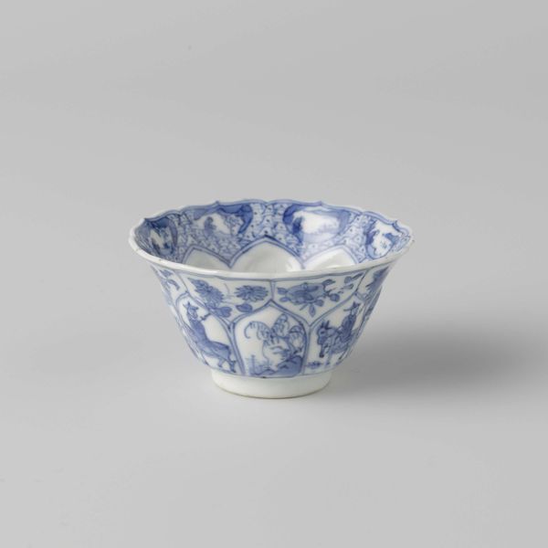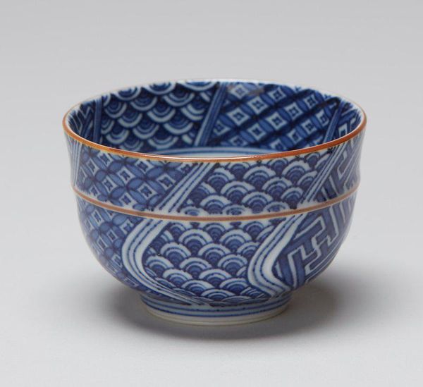 This is a ceramic bowl in Shonsui style, crafted by Katō Mon’emon. The immediate impression is one of detailed complexity. A striking blue and white palette wraps around the bowl, divided into vertical panels each showcasing a unique pattern. This variety creates a dynamic visual rhythm. The form itself, undulating at the rim, invites touch. The bowl is more than a vessel; it is a study in contrasts and repetitions. The geometric precision of the checkered and wave patterns juxtaposes against the more organic floral motifs. This interplay is suggestive of a tension between order and nature. Consider the semiotic function of these patterns. Each design acts as a signifier, potentially referencing cultural values or natural phenomena. By placing these disparate signs side-by-side, the artist prompts a dialogue, destabilizing any singular interpretation. The arrangement encourages a continuous re-evaluation. It reminds us that meaning is not fixed but emerges from the relationships between elements. This ceramic work exemplifies how art can function as a site of ongoing interpretation.