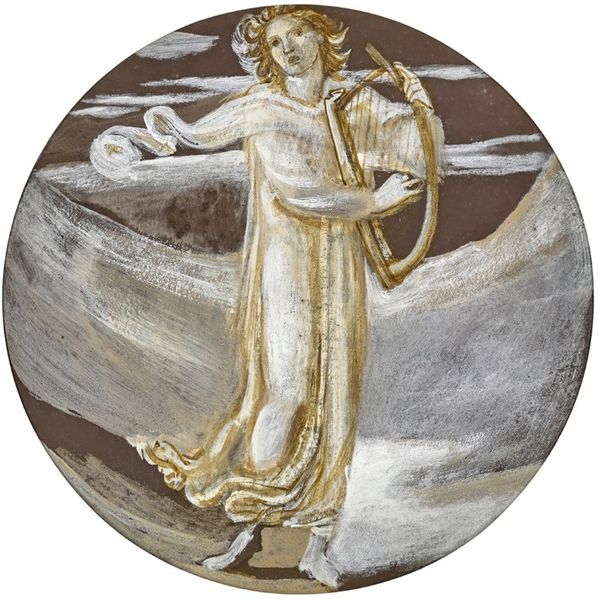 Curator: Edward Burne-Jones created this drawing, titled "Orpheus and Eurydice Reunited." The piece employs pencil and is rooted in the visual style of Romanticism. Editor: Well, right off the bat, it hits me as raw, unfinished—but so full of longing. Like catching a glimpse of something sacred in a dream, do you know? The circular format kind of heightens that feeling of intimacy, too. Curator: Intimacy is a great way to put it. Burne-Jones here is reimagining a pretty intense moment from the Greek myth, where Orpheus, a musician, actually gets his dead wife back from the Underworld... on one condition. Editor: Ah, the condition: He couldn't look back at her until they both were back on earth! And the poor guy… spoilers for anyone unfamiliar, but he glances back and loses her again! Curator: Precisely. So, what do you see here in terms of the iconic representation? The symbol set? Editor: Notice the almost statue-like quality of their embrace, the swirling of fabric creating this vortex effect. Even though it’s just pencil, the layering of light and shadow gives the work the feeling of a deeply etched carving, like memory itself becoming manifest. Curator: It's very suggestive, and the circular form does evoke carved tondos common in earlier eras, almost like an ancient coin depicting a tragic love. It highlights the figures’ vulnerability, doesn’t it? Considering their fraught story. Editor: Absolutely! This piece goes beyond depicting the moment; it conveys the feeling of a second chance tinged with inevitability. The contrast of the white pencil strokes with the darkness adds an undeniable gravity, the sense that perhaps happiness in this life is as fragile as these delicate lines. Curator: A wonderful insight. Seeing Burne-Jones embrace this emotionally charged moment with such vulnerability... you almost feel yourself reliving their desperate hope, however fleeting. Editor: Precisely. For me, it really comes down to this portrayal, this almost desperate embrace. So powerful and very bittersweet!