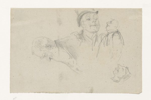 Curator: Here we have "Haas en jager," or "Hare and Hunter," a pen and ink drawing by Johannes Tavenraat, estimated to be made sometime between 1840 and 1880. What’s your immediate take? Editor: I’m struck by the feeling of a fleeting moment—almost like a half-remembered dream. The rabbit, especially, seems caught mid-leap, and the hunter below, he's... timeless? Curator: Timeless is a great word. To me, Tavenraat captured this everyday tension between predator and prey, literally. Hunting, after all, carries a very loaded history tied to land ownership, social class, and access to resources, something definitely worth unpacking here. Editor: Absolutely, the right to hunt, or the lack thereof, historically shaped hierarchies. I am interested in what is evoked by this composition. The artist has chosen to use a simple pen and ink. Is this intentional so as not to give favor to the hunter in that he uses simplistic, unadorned medium? Curator: It's intriguing to ponder that maybe Tavenraat opted for ink to convey rawness, and maybe even make a statement on ethics surrounding the act of hunting, considering class distinctions during this period. But on the flip side, genre paintings were also popular then—showing everyday life, almost romanticized at times. Editor: It could easily be that, it’s definitely multi-layered. It makes me wonder who the intended audience was and whether the piece served a purpose beyond art, perhaps communicating ideas about societal roles, economic disparity, the hunter/hunted dichotomy—which transcends just the literal reading of hare versus human. Curator: You've totally got me thinking... It might be worth seeing how it was originally received back then. Because context, well, it changes everything, doesn't it? And yet, as art it also lives outside that particular context now. Editor: Precisely! Now we look through our lenses—informed by contemporary ideas of social justice. And that interplay is, for me, where this work truly speaks.