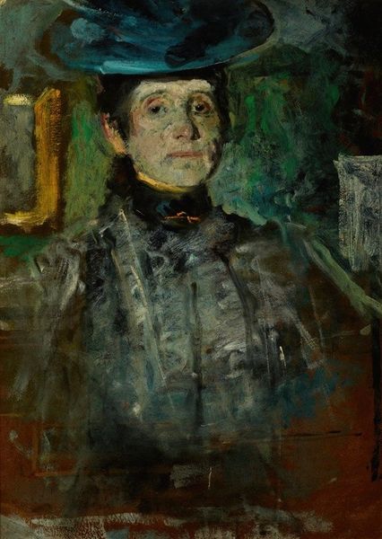 Editor: Here we have Isaac Israels' "Portrait of a Woman," an oil painting currently residing at the Rijksmuseum. The brushstrokes seem so loose, almost unfinished, which gives it a really immediate feel. What stands out to you in this piece? Curator: Well, I'm particularly struck by how Israels handles the paint itself. Look at the impasto in the white scarf, contrasting with the thin washes defining her face. It directs our attention to the *doing* of the painting, the labor involved. Think about where Israels sourced his pigments. Were they readily available? How did their cost affect his choices, perhaps pushing him towards these darker, earthier tones dominating the work? Editor: So you’re saying the economic conditions impacted even the aesthetic choices? Curator: Absolutely. Furthermore, the sitter's clothing is really informative. Her attire likely reflects the economic status and societal roles prevalent at that time. Were these mass-produced fabrics or luxury goods? That would say a lot about her place in the broader consumer economy. What kind of labor went into making that hat she’s wearing? We can read a lot about society's values and manufacturing from simply looking at her clothes. Editor: I never considered looking at a portrait in that way. I was focused on the emotion, but it's really about the materials, isn’t it? Curator: Precisely! And don’t just see materials in isolation – explore how they are sourced, transformed, and ultimately consumed within a specific historical and social context. That's where the real story lies. Editor: That’s such a shift from thinking about individual genius to the conditions of artistic creation! Thank you.