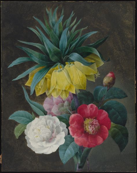Editor: We're looking at Pierre Joseph Redouté's "Pink Roses in a Vase" from 1838, rendered beautifully in watercolor. I’m struck by the contrast between the soft, delicate roses and the almost somber dark background. What stories do you see woven into this seemingly simple still life? Curator: Beyond its surface appeal, consider what a seemingly simple image of flowers communicated in 1838. Redouté was known as the "Raphael of Flowers" and catered to an elite clientele, often women. Think about the social implications. Who had access to art and education? How were women of this era, particularly within the upper classes, engaging with the natural world, and what power structures defined that engagement? Editor: So, the image might seem apolitical, but the very act of painting flowers, and who had access to those paintings, tells us about class and gender. Is that right? Curator: Precisely. Consider also the symbolism inherent in flowers themselves. During this period, the "language of flowers" was highly developed. Roses, especially pink ones, often symbolized grace, gentility, and admiration. Whose gaze are these roses intended for? Who is being invited into this space of beauty and privilege, and who is excluded? Redouté wasn't just painting roses; he was painting a portrait of a specific societal value system. How might the presentation of beauty uphold social hierarchies? Editor: That’s fascinating! I hadn't thought about the encoded social meanings. I guess a rose is never just a rose, right? It's like a visual representation of power. Curator: Exactly. And that’s where art history becomes a powerful tool. It helps us dissect those systems and understand their historical roots, while interrogating whether these power dynamics remain present. Editor: Thank you. It makes me want to research how flower paintings changed across social movements and different historical periods. Curator: Indeed, and consider the intersectional element between social movements and botanical art history as part of your ongoing work.