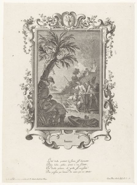Editor: This is "Augustus," an engraving by Johann Esaias Nilson, created in 1766. The whole thing, frame and all, has this very formal, classical feel, yet the figures in the central image are so relaxed. It’s an interesting contrast. What do you make of this piece? Curator: The formality you observe is quite deliberate. This engraving encapsulates the pervasive nostalgia for the classical world prevalent during the Baroque period. It presents an idealized past – what symbols and gestures connect this pastoral scene to a cultural memory of "Augustus?" Editor: Well, "Augustus" is right there in the title, connecting it directly to Roman emperors, I presume. Also, the woman carrying fruit on her head - does that recall classical statues? Curator: Precisely! And consider the other figures: reclining, conversing idly beneath the tree. These visual cues, when read together, can recall imagery from Roman frescoes and mosaics depicting idyllic pastoral life, often tinged with references to imperial power and bounty. Do you see how the artist evokes this cultural memory? Editor: Yes, I do! Now that you mention it, the monument also reinforces it with what looks like Latin script...So it's less a true landscape and more a carefully constructed symbol, then? Curator: Indeed. The scene is less about representing the everyday world and more about creating a symbolic space, echoing ideals of a bygone era through classical symbols. That deliberate referencing shapes our reading of the entire composition. Editor: This connection between historical imagery and contemporary representation, presented via symbolic encoding, really enhances the understanding of cultural perception. Thank you. Curator: And understanding that interplay lets you appreciate the layers of meaning embedded in seemingly simple images!