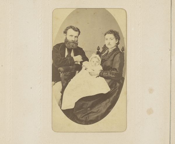 Curator: This is “Family Portrait with Father, Mother and Daughter,” a daguerreotype from sometime between 1861 and 1866. It's currently held here at the Rijksmuseum. Editor: The picture’s making me feel a little…wistful? It's small, but the formality of the poses and clothing hints at a world of unspoken expectations. Curator: Absolutely. These early photographic portraits were such precious commodities. Each pose, each prop had to communicate status and respectability. Note how the father, presumably the head of the household, anchors the composition. Editor: Yes, the father is on the right, positioned at a diagonal. What I am finding striking is how the subjects' gaze is fixed, as if confronting an uncertain future. Do you think that has anything to do with that specific period? Curator: Inevitably. This was a time of great social change, technological advancement, and evolving ideas about family roles. But look at the technical aspects: the subdued tones, the meticulous details captured in the faces... a poignant reflection of Victorian ideals frozen in time. Editor: Speaking of capturing details, the way light hits the ruffled dress of the daughter on the left... almost ethereal in contrast to the solemnity surrounding her. Curator: That is an incredible observation! I can also see how the materiality contributes significantly to how we interpret this artwork. Daguerreotypes involved a painstaking process. There's an inherent value projected onto the object itself. It becomes almost a relic. Editor: More like a tiny time capsule—carrying echoes of vanished lives! I can also relate that the way the sitters seem stiff is due to the exposure time to properly record such intricate details, right? Curator: Precisely. Exposure times meant sitters had to remain still for extended periods, resulting in the stoic expressions and stiff postures we observe. This immobility contrasts sharply with our modern experience of the instant selfie. Editor: And that's precisely why it continues to resonate. The daguerreotype technique invites us to reflect on the ephemeral nature of existence and to appreciate the unique ability of early photography to immortalize a specific point in time. Curator: Well said! A profound portrait not just of three individuals, but of a pivotal moment in the evolution of self-representation and technology.