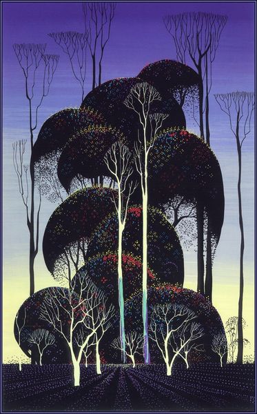 Eyvind Earle's 'Dark Silence' uses a striking contrast between light and shadow to evoke a deep emotional response, drawing us into a world of subconscious reflection. Notice how the trees are stylized, bearing a resemblance to the 'tree of life' motif that appears across cultures, representing interconnectedness and spiritual growth. Earle's minimalist style is especially evocative, recalling the ancient symbol's presence in both religious and secular contexts from the Middle East to Europe. The stark contrast between the illuminated trees and the dark surroundings speaks to a universal human experience – the delicate balance between hope and despair, knowledge and ignorance. This contrast has also been adopted throughout history, notably in Romanticism, often evoking the sublime and our struggle to find meaning in a vast, complex world. In 'Dark Silence', Earle taps into our collective memory, using symbolism to invite viewers into a profound, introspective experience.