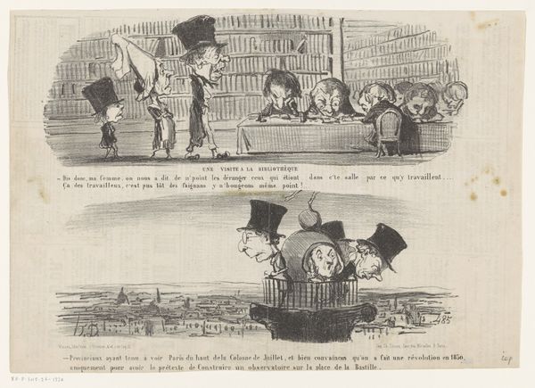 Curator: This is a lithograph by Honoré Daumier, created around the 19th century. Its title translates to "A solicitor watches for the arrival of the savage Bineau, Minister of Public Works." Editor: My initial reaction? It's dripping with satire. The grotesque exaggerations in the figures feel simultaneously amusing and cutting. What exactly are we looking at? Curator: Daumier was a master of caricature. This print appears to depict a political scene. The upper register seems to show a supplicant awaiting Minister Bineau, visually characterizing Bineau, rather cruelly, as animalistic and crude. The lower portion offers a depiction of servitude during inclement weather. Editor: Looking at the lower section, you really get a feel for the production here. The figures appear quickly sketched; you can practically see Daumier’s hand moving rapidly across the lithographic stone to suggest motion and the teeming masses of bodies. And it conveys a very particular class dynamic, I think, of the 'big man' in question and the subservient person. Curator: The “savage Bineau” moniker is quite striking. What societal anxieties do you think it targets? Consider how animalistic or "savage" tropes have historically been utilized. Editor: Perhaps the implication is that in the rush to attain and preserve power, these ministers abandoned all decorum; and it feels really blunt in its judgement of what the political system can degrade people into doing. But what of the other symbols or repeated figures: Do these tell us of similar instances elsewhere at that time? Curator: It does. We need to read this lithograph in its historical context as something of a cultural commentary, an effort to mock and undermine certain established icons in governance using caricature as a tool. We have to reflect on lithography's inherent reproducibility to see this artwork as having tremendous significance due to the audience it would have achieved. Editor: Yes, that mass dissemination shifts the way we have to regard this artwork; lithography created prints available for the ordinary citizens who would recognise such lampooning for figures with established symbolic and political meaning. This becomes an almost dangerous act of cultural critique. I'm just so stuck on those stark material contrasts here; it's striking how the material both amplified and constrained Daumier’s scathing indictment of political life.