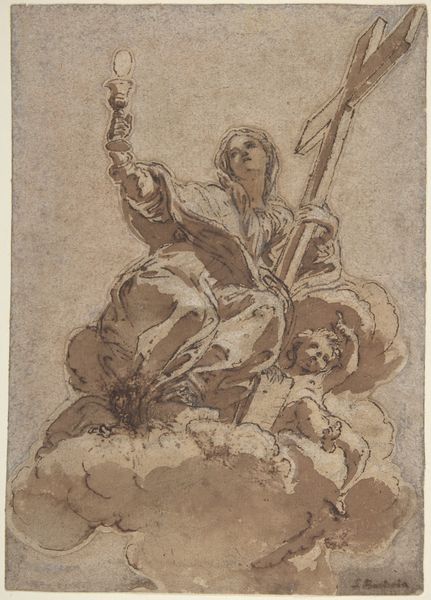 Editor: This drawing, "St. John the Baptist," dates back to around 1600, crafted with ink and watercolor on paper by Cherubino Alberti. It's striking how unfinished it feels, almost dreamlike in its muted blues and browns. What captures your attention when you look at this piece? Curator: Ah, Alberti's St. John… to me, it’s less a finished piece and more like a fleeting thought, caught on paper. The washes of watercolor give it that ephemeral quality, like a half-remembered vision. Notice how the lines are so assured, yet the coloring is so suggestive. What do you make of the lamb, lurking at John’s feet? Is it cuddly? Ominous? Both? Editor: It's… unsettlingly adorable? Like it knows something I don't. And you're right about the coloring; it almost feels like he's emerging from the shadows. I wouldn’t have considered the wash technique deliberate but I guess that makes sense for this theme, right? Curator: Exactly! Think of John as a liminal figure – bridging the Old and New Testaments. The medium mirrors the message, doesn't it? Alberti’s not just showing us a saint, he's giving us the *idea* of a saint. The vagueness is the point, letting our minds fill in the spiritual blanks. It's a clever bit of visual theology, don’t you think? Editor: It definitely makes me appreciate the thought behind it! I guess sometimes "unfinished" isn't really unfinished, just… strategically suggestive. Curator: Precisely! It’s about the artist inviting us into the creative – and spiritual – process.